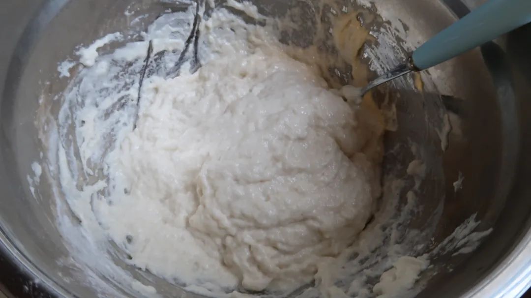将酵母水倒入250克面粉中,搅拌至无干粉状态,然后发酵90分钟。