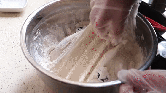 将条状面团揉搓至20-25厘米长。