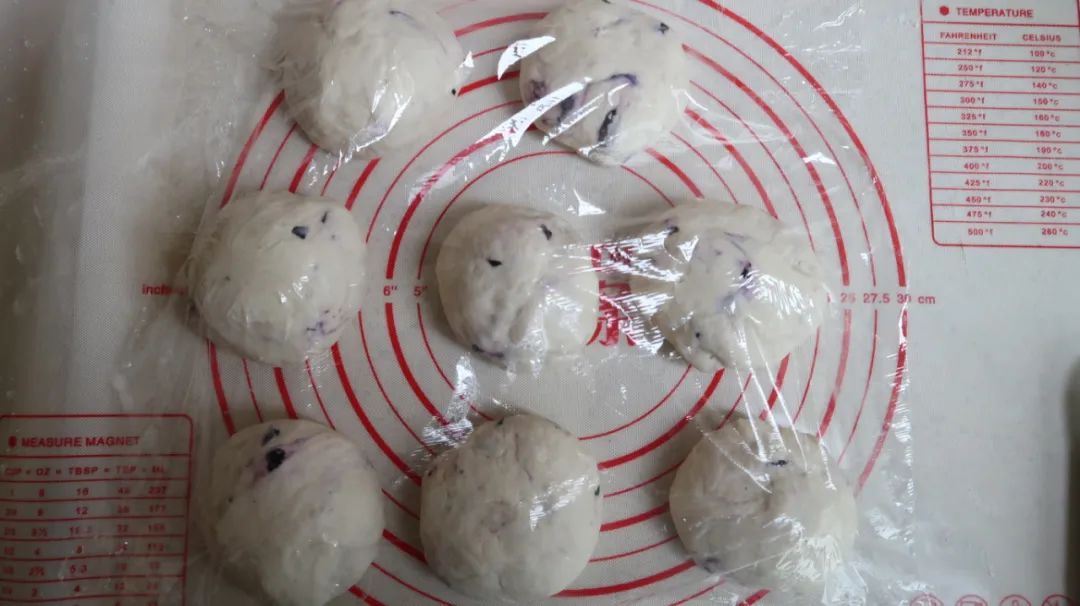 将发酵好的面团等分成多份,每份100克左右。揉成光滑的小面团,盖上保鲜膜,静置20分钟。
