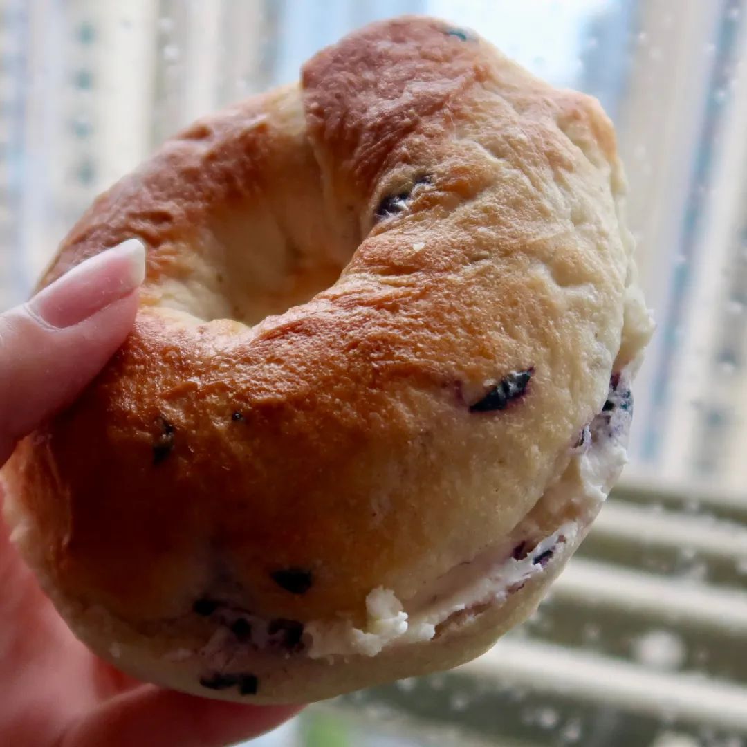 温热的蓝莓贝果加上奶油奶酪