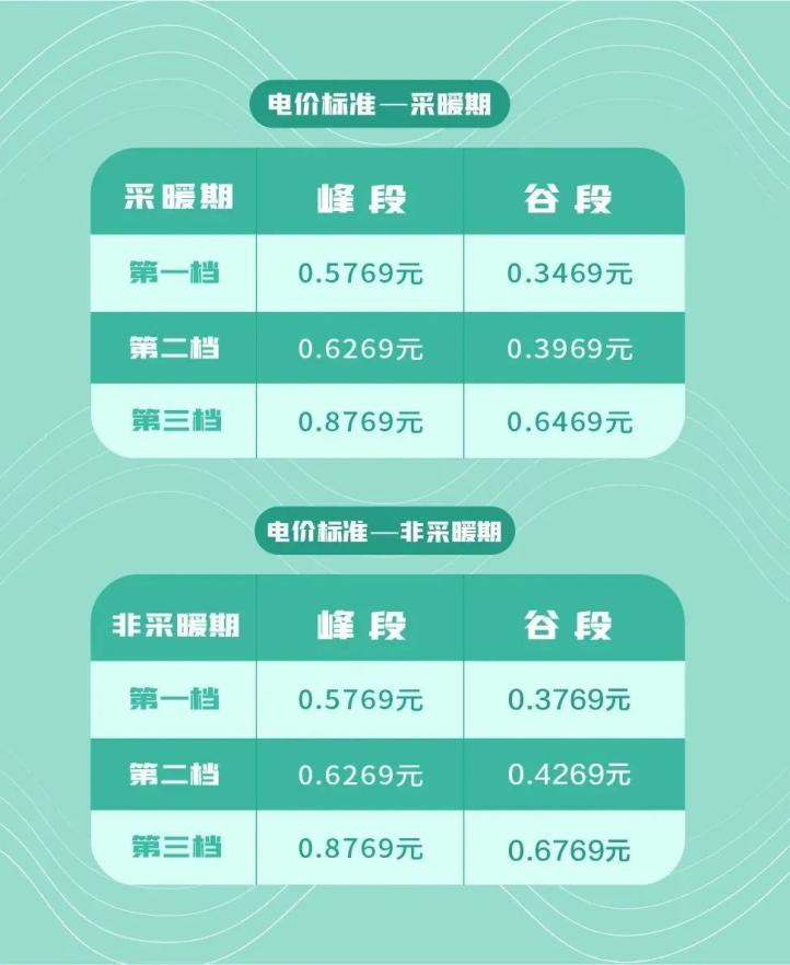 在现行阶梯电价标准基础上,峰段电价每千瓦时提高0.03元(含税,下同);谷段电价降低0.17元。其中采暖期谷段电价由降低0.17元调整至降低0.2元。