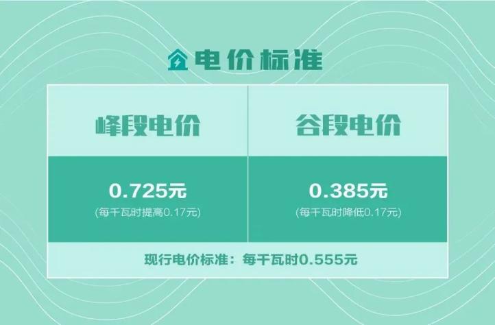 在现行电价标准(每千瓦时0.555元)基础上,峰段电价每千瓦时提高0.17元;谷段电价降低0.17元。