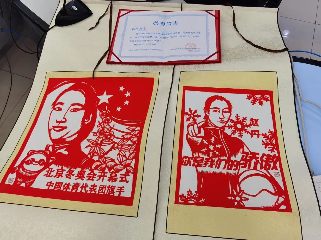 这两幅作品是民间剪纸艺人董存娥在冬奥期间所剪的。得知北京2022冬奥开幕式旗手是内蒙古姑娘赵丹,原本春节前最忙碌的民间剪纸艺人董存娥,给自己再添工作量,她说在那些天她不断在电视上、手机上寻找关注赵丹的新闻和她的钢架雪车运动项目,捕捉特点,艺术再升华,只要灵感来了,再晚也要加班加点一剪一剪剪出她想象的赵丹。