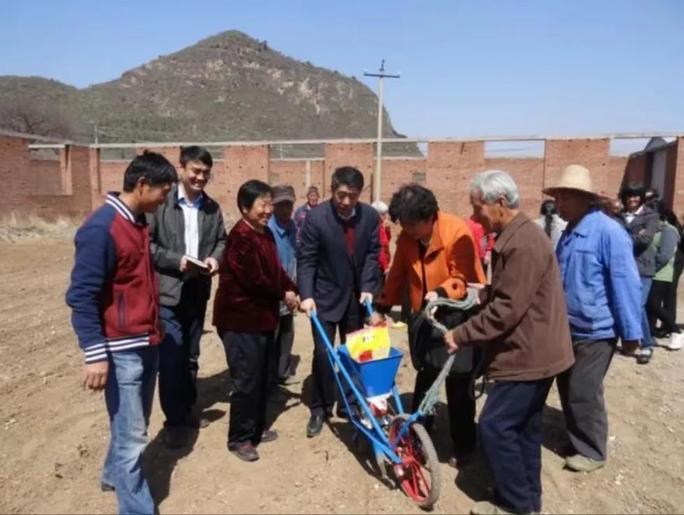 赵久然(左四)在密云苏家峪指导农户使用小型播种机