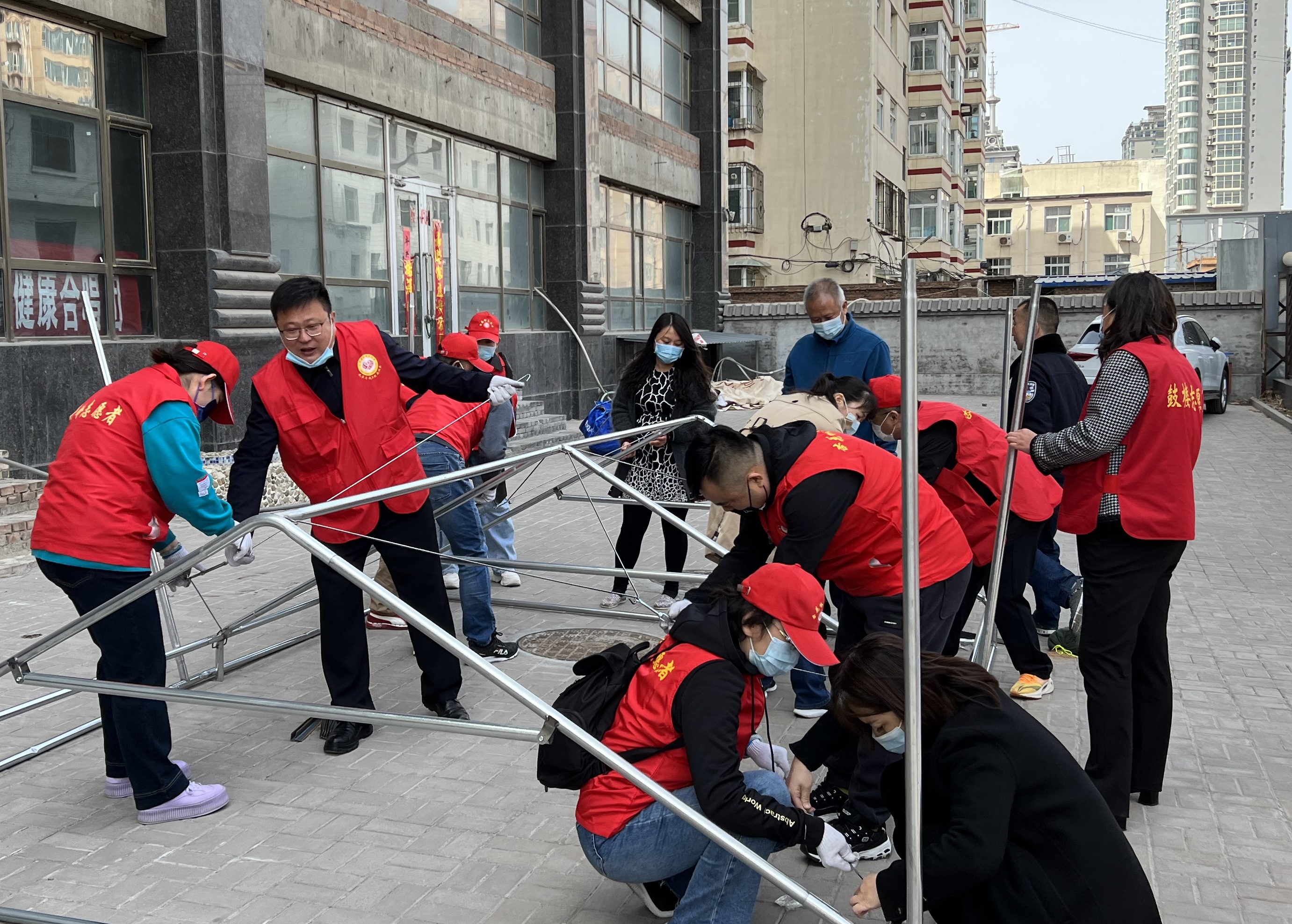 查看场地、搬运材料、组装部件、搭棚固桩……在采样点帐篷搭建过程中,党员志愿者们分工明确,通力协作。孟巍率先上阵,一边指挥一边操作,团队成员也不甘示弱,争先恐后,大家尽己所能,齐心协力,终于在晚上9点左右,社区内的三个核酸采样点防疫帐篷快速搭建完毕。