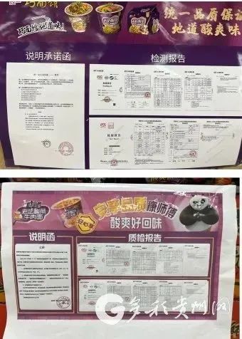 在永辉超市恒峰步行街店,记者看到统一、康师傅老坛酸菜牛肉面摆放在显眼区域,货架上还贴上了企业说明函与检测报告。
