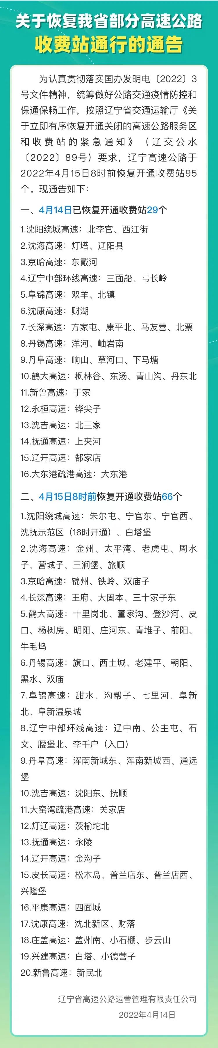 自4月15日8时起,沈吉高速沈阳东站,绕城高速朱尔屯站、宁官西站、宁官东站、白塔堡站、沈抚示范区站,灯辽高速茨榆坨北站,丹阜高速浑南新城东站、浑南新城西站,沈康高速沈北新区站、财落站,辽中环线高速辽中南站、公主屯站,新鲁高速新民北站等14个收费站出入口双向恢复通行。