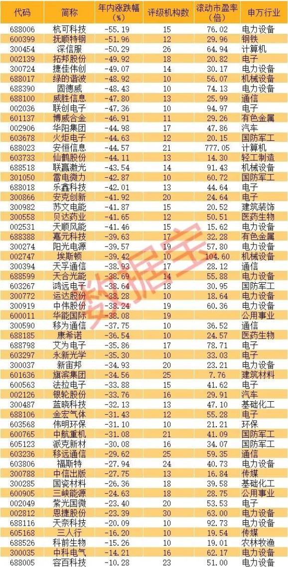 从机构关注度来看,恩捷股份有30家机构评级榜单第一。此外,深信服、旗滨集团、移远通信等个股均有20多家机构评级。从年内表现来看,杭可科技、抚顺特钢、深信服等个股跌超50%,拓邦股份、捷佳伟创、绿的谐波等个股跌逾40%。