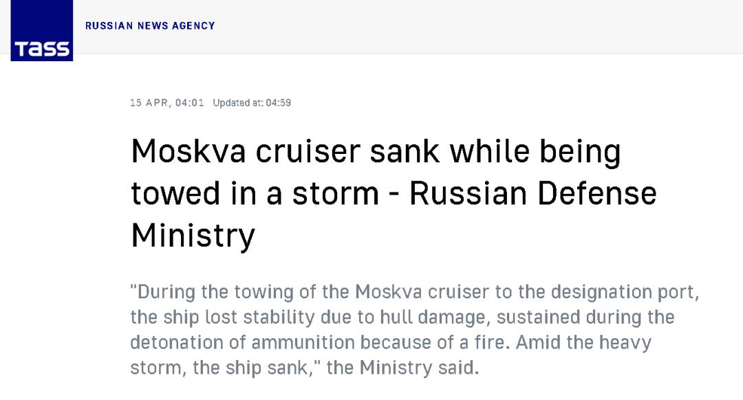 据俄罗斯塔斯社报道,俄罗斯国防部于当地时间周四在一则声明中表示,受风暴影响,因爆炸受损的俄罗斯黑海舰队的旗舰“莫斯科”号巡洋舰已经沉没。