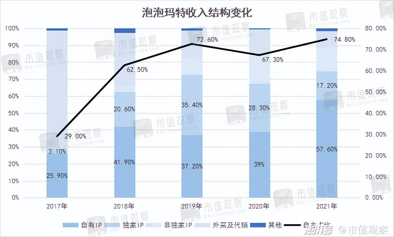 财报数据显示,相比于2020年,2021年泡泡玛特的自主IP收入占比达到74.8%,较上一年净提升7.5个百分点,其中授权权限最高的自有IP收入占比更是来到57.6%的历史新高。