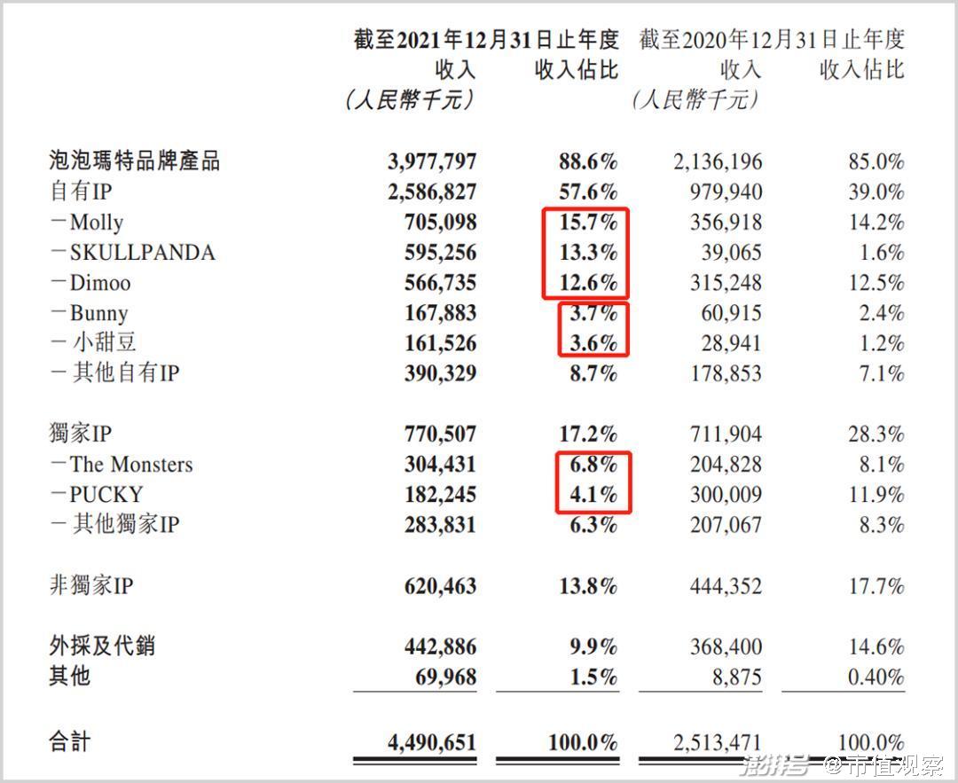 从大的层面看,决定一家潮玩IP运营商创意持续能力的关键数据是——潮玩IP产品,尤其是“自主潮玩IP”(包括自有IP与独家IP)的收入占比。