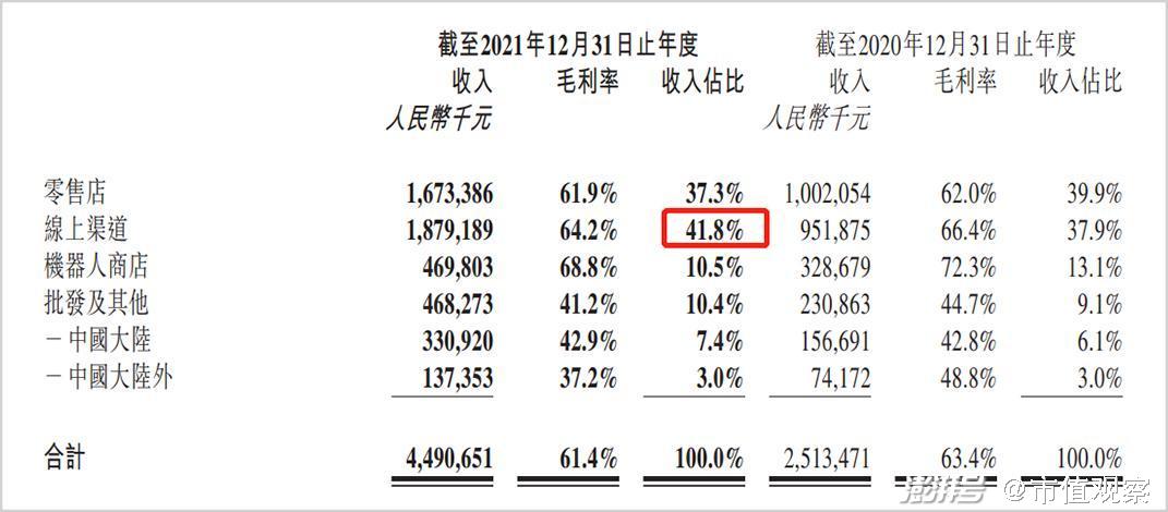 过去一年,泡泡玛特包括零售店、机器人商店、线上渠道、批发在内的四大渠道均获得了可观的增长,同比增速分别为67.0%、42.9%、97.4%、102.8%。其中以微信小程序、天猫、京东为主的线上渠道收入占比首次超越线下渠道,此外批发渠道收入也首次超过机器人商店,渠道呈现百花齐放的形态。