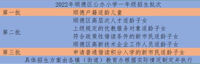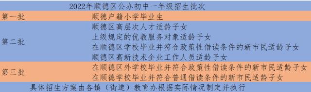 入读顺德区小学的学生,必须是2016年8月31日(含8月31日)前出生且未接受过义务教育的适龄儿童。入读顺德公办初中的学生,必须是受完规定年限小学教育并在全国学籍系统已作毕业处理的应届小学毕业生、学校的招生规模要按照《顺德区教育局关于下达 2022 学年度中小学校招生计划的通知》(顺教〔2022〕51号)执行。各镇(街道)教育办要严格控制班额、统筹安排、合理分流,确保招生班额符合省定标准要求,不得出现大班额现象。