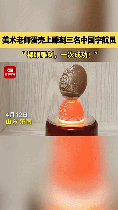 近日,山东济南一小学美术老师常永东耗时3天,在0.3毫米厚的蛋壳上雕刻了神舟十三号3位航天员,还做了一个蛋壳底座。常永东表示,这套蛋雕作品是裸眼雕刻,没有借助任何放大工具一次性成功的,总共雕刻了上万刀。创作难点是3位人物头像在同一个蛋壳上进行构图,头像小,雕刻眼睛是最大的难点。常永东称,创作这个作品是想激发学生们的飞天梦,用这种独特的方式欢迎3位航天员凯旋。