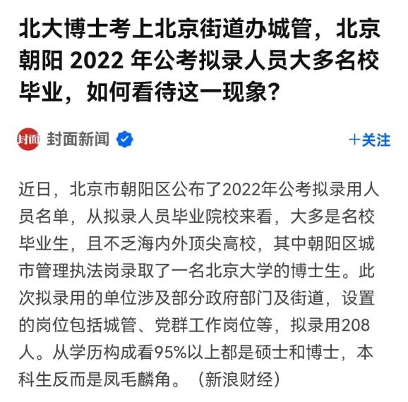 ●北大博士考上北京街道办城管,北京朝阳2022年公考拟录人员大多名校毕业,如何看待这一现象?
