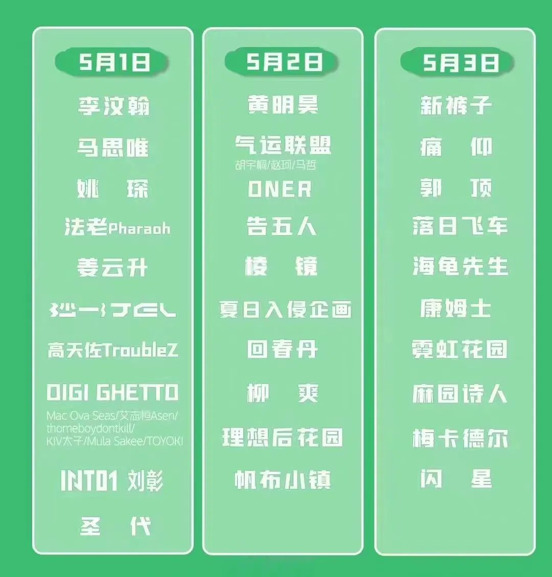 成都:INTO1-刘彰(说唱压轴嘉宾)、Carsick Cars(晕车车,摇滚压轴嘉宾)、Young(北门之子杨建坤)