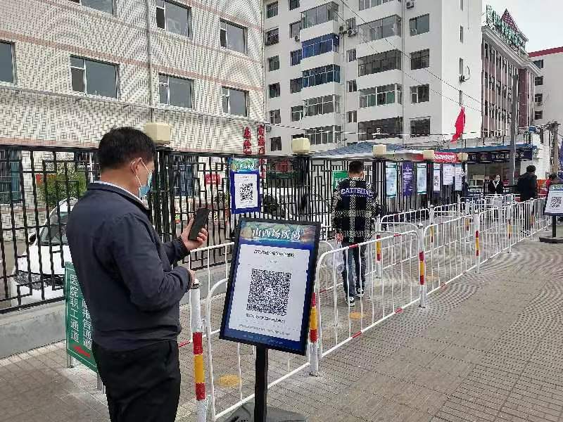 4月15日8:30,在古交市中心医院入口处位置张贴的“场所码”十分醒目,医院相关工作人员一边提醒就诊人员扫码,一边查验其健康情况及行程卡信息。笔者又走访了古交市各大医院发现,凡是来就诊的患者、陪同人员及其他外来人员均需要扫码进入医院。