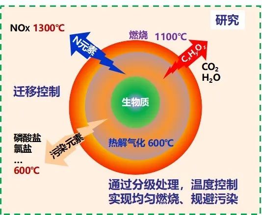 针对秸秆传统高温燃烧过程中存在的腐蚀,结渣、氮氧化物排放的问题,本团队开展了燃烧温度、添加剂对秸秆碱迁移及气体产物影响的探索实验研究,根据实验结果所得的产物生成临界温度,设计了一套分级均匀燃烧装备,通过空气流量控制热解燃烧温度,避免NOx与磷酸盐、氯盐的生成。经测试,该装置的生物质燃烧效率为99.9%,锅炉热效率可达92%以上,未经净化的烟气NOx含量符合直接排放标准(<180mg/Nm3),实现了生物质高效清洁燃烧。目前在安徽省揭榜挂帅项目的资助下,与安徽省海螺集团合作,开展水泥生产大比例(大于40%)燃料替代研究,用来降低水泥生产的碳排放。