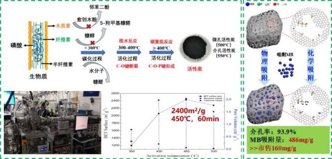 高比表面积碳材料因其良好的吸附性能被广泛应用于环境治理。然而传统方法制备的生物质碳材料,存在孔隙率低、吸附性能差的问题,利用价值较低。本团队为了实现生物质的高价值化利用,对生物质碳材料的活化造孔机理及污染物吸附机制进行探究,开发了磷酸水热预处理联合热解技术制备碳材料,所得碳材料的比表面积可达2400 m2/g,远高于市售活性炭(~1000 m2/g),且可通过调节活化温度改变活性炭的微孔/介孔的占比,实现孔径调控。所得的介孔活性炭的介孔率高达93.9%,亚甲基蓝(MB)吸附量约为市售活性炭的三倍(486mg/g)。