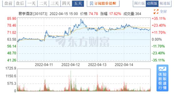 截止今日(4月15日)收盘,君亭酒店报74.78/股,这就意味着,仅半年时间该股已翻倍不止。且今年3月至今,君亭酒店已经历三次单日涨幅达20%。