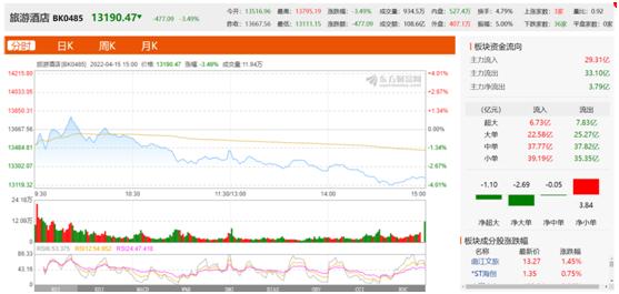 截至4月15日收盘,旅游酒店板块指数报13190.47点,跌幅达3.49%,39家中上涨3家,下跌36家。