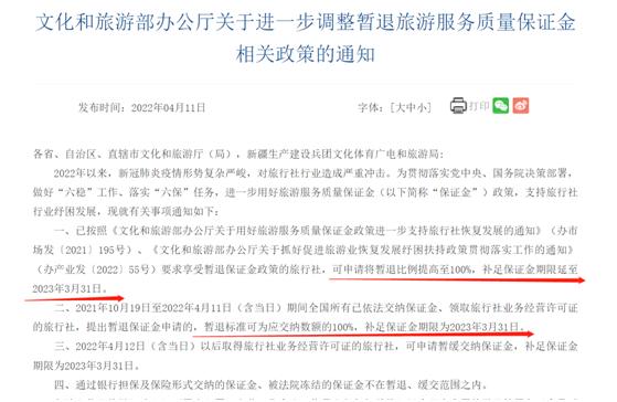 随后政策再进一步支持旅行社行业纾困发展。4月11日,文化和旅游部办公厅印发《关于进一步调整暂退旅游服务质量保证金相关政策的通知》(以下简称《通知》),提到享受暂退保证金政策的旅行社,可申请将暂退比例提高至100%,补足保证金期限延至2023年3月31日。