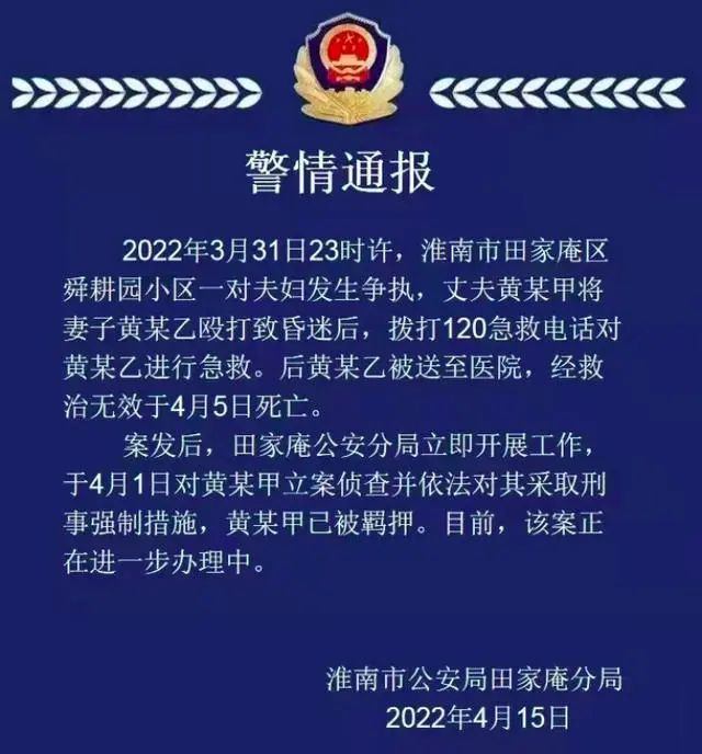 4月15日,淮南市公安局田家庵分局发布警情通报。根据通报内容,2022年3月31日23时许,当地一对夫妇发生争执,丈夫黄某甲将妻子黄某乙殴打致昏迷后,拨打120急救电话对黄某乙进行急救。后黄某乙被送至医院,经救治无效于4月5日死亡。案发后,田家庵公安分局立即开展工作,于4月1日对黄某甲立案侦查并依法对其采取刑事强制措施,黄某甲已被羁押。目前,该案正在进一步办理中。