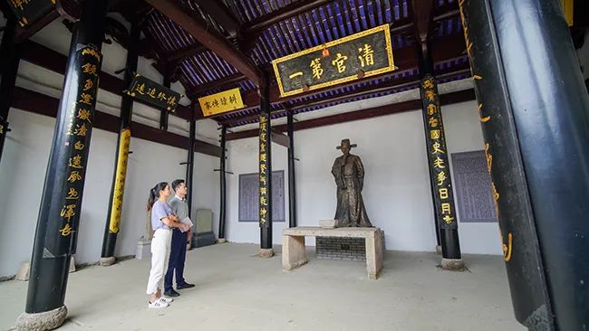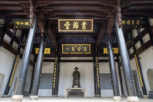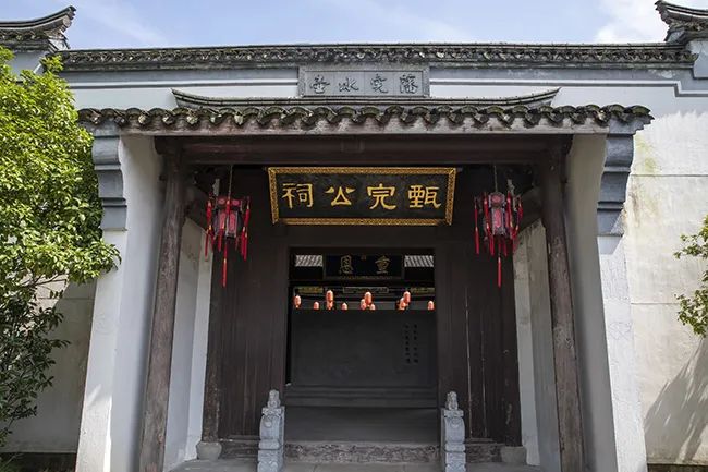 祠堂又名昼锦堂,体现甄完功名昭著,但两袖清风而返归故里,日月可鉴。正厅内,立有一尊身高2.5米的甄完铜像。甄公一手拈须,一手执文,身形精炼,目光深邃,尽显其忧国忧民、勤政操劳的形象。铜像上方悬挂“清官第一”匾额,两侧楹联所书“清官垂国史,光争日月;硕德重乡贤,气满乾坤”,厚重端庄,立于其间,自有一股肃然正气涌上心头。而“烟山苍茫,荟萃人文家声远;镜水澄澈,清白遗风世泽长”“布政布德,彩烟千古承遗泽;清水清声,澄江一脉继高风”等楹联,则是对甄完卓著功绩、高尚人格的集中概括和热情歌颂,以及对清白家风传承延绵的认同、期许。