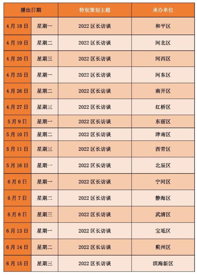 “向群众汇报──2022区长访谈”明天开播。2022年4月18日—6月15日,市政府办公厅、市网信办、海河传媒中心将在天津新闻广播《公仆走进直播间》联合推出“向群众汇报──2022区长访谈”特别策划。4月18日(周一)早8:00—9:00,第一期节目将邀请和平区区长郑伟铭做客天津新闻广播和津云中央厨房直播间,谈思路、话举措,回应群众关切!(详情)
