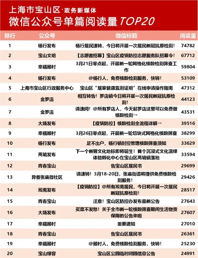3月爆款推文中,排名榜首的来自杨行发布的《杨行居民速转,今日将开展一次居民新冠抗原检测!》,阅读量近7.5万,“爆款”推文TOP20中,幸福顾村占4席, 青春宝山、杨行发布各占3席,金罗店与大场发布各占2席,其余公众号也表现不俗。