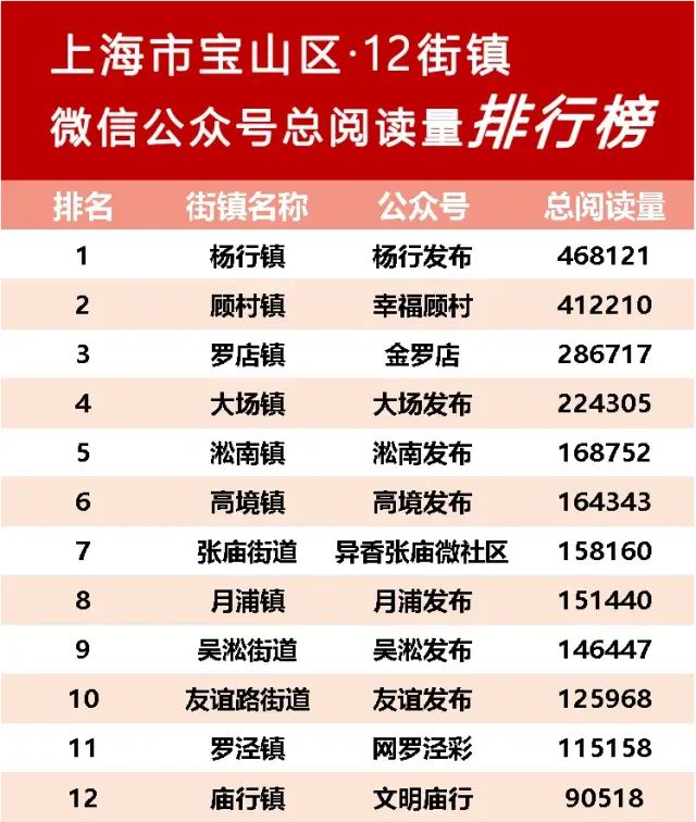 总阅读量是一个公众号发布的所有文章的累计阅读量,一定程度上反映了该公众号的总体实力。全区12个街镇3月份总阅读量榜单中,排行榜首的是杨行发布,共计发布推送61篇,总阅读量468121。幸福顾村、金罗店分列二、三名。