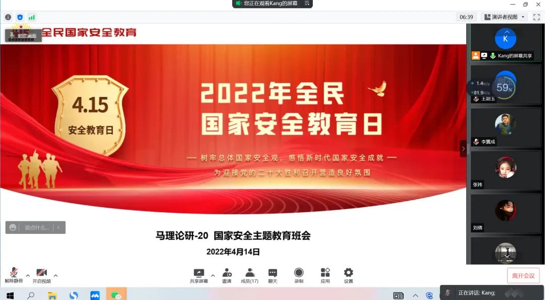 各学院组织召开国家安全主题班会,收看“千万师生同上一堂国家安全教育课”“国开大讲堂·国家安全教育公开课”等内容,研讨学习国家安全法律法规,撰写学习心得体会。同学们普遍认识到,作为新时代青年学生,必须充分学习国家安全知识,强化维护国家安全的责任和义务,提高鉴别能力,时刻警惕生活中危害国家安全的行为,维护国家安全,护航民族复兴。