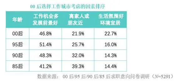 《报告》显示,46.8%的00后会优先选择“工作机会多,发展前景好”的工作城市,这一比例与85后、90后差别不大,也是首选“城市宜居度”00后的2倍多。同时,00后表现出更高的闯劲和独立性,仅有21.9%的00后首选“离家人或朋友近”的工作城市,比85后和90后分别低17个百分点、10个百分点。