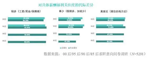 相应来说,00后更看重工作与生活的平衡,对假期充足度、加班程度、通勤距离都格外关注,其中00后对“事少”、“离家近”的关注度,分别比85后高出10个百分点以上、约4个百分点。