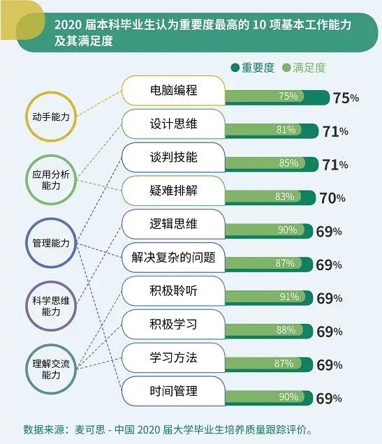 数据显示,2020届本科毕业生认为动手能力中的电脑编程能力(75%),应用分析能力中的设计思维(71%)、疑难排解能力(70%),管理能力中的谈判技能能力(71%)、解决复杂问题能力(69%)、时间管理能力(69%),理解交流能力中的积极聆听(69%)、积极学习(69%)、学习方法能力(69%),以及科学思维能力中的逻辑思维能力(69%)的重要度均较高。