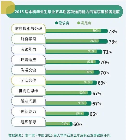 麦可思基于本科生毕业五年后的反馈研究发现,信息搜索与处理、终身学习能力在工作岗位中的需求程度最高,但终身学习能力满足工作的比例仍相对较低。