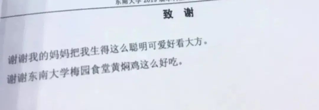 “感谢虽然不够聪明,但始终尽力去坚持、去热爱,去保持乐观的自己”“谢谢我的妈妈把我生得这么聪明可爱好看大方,谢谢东南大学梅园食堂,黄焖鸡这么好吃”“我想谢谢我的男朋友,谢谢你过去五年,一直不曾出现于,我的生命中,使得我的研究进展异常顺利”“感谢这个世界还有文学”……