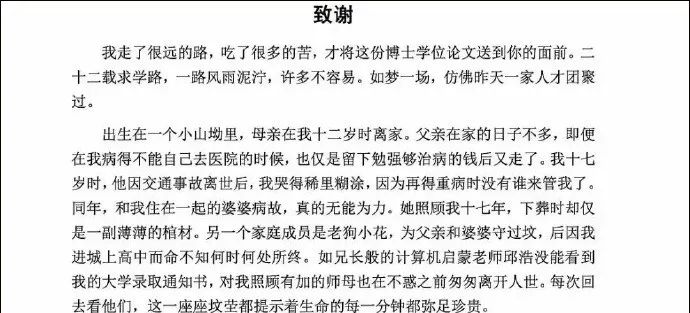 比如中科院工学博士黄国平的论文致谢,讲述母亲在他12岁时离家,父亲在他17岁时出车祸去世,而他“只愿年过半百,归来仍是少年,希望还有机会重新认识这个世界,不辜负这一生吃过的苦”,被网友们称为现代版《送东阳马生序》;再如东南大学工学博士仲济涛感谢博一与自己结婚的妻子,被读者喻为现代版的《项脊轩志》。