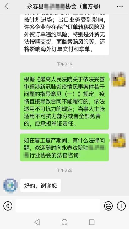 “你们行业的企业在复工复产中主要有什么困难?目前有什么需求……?”永春法院民事审判庭的法官正通过微信向各行业协会的联络人了解企业复工复产情况。为了及时满足企业司法需求,永春法院依托驻行业协会法官工作室平台机制,为企业提供“司法保障复工复产”线上咨询服务,通过“屏对屏”实时交流互动,及时解答企业最关心的法律问题。
