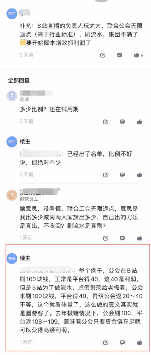 而此次裁员原因可能为B站直播区与入驻公会关系的失衡,直播部门“允许”入驻公会用高于行业的标准无限返点刷流水,导致直播区生态失衡。该匿名人士举例表示,公会在B站刷100元,正常B站会从中抽取40元,但如今为了做流水,B站会再给公会返20-40元不等,去年极端情况下,公会刷100元,平台甚至会返108-109元,这意味着公会只要资金链充足就可以获得高额利润。