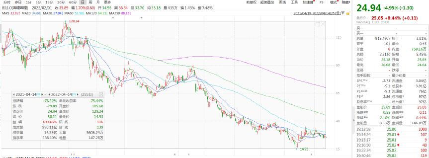 股价方面,B站股价曾在去年6月一度攀升至129.24美元/股的高位,随后一路暴跌至14.93美元/股。截至4月14日美股收盘,B站报收24.94美元/股,近一年股价跌幅超76%,市值仅剩97亿美元。