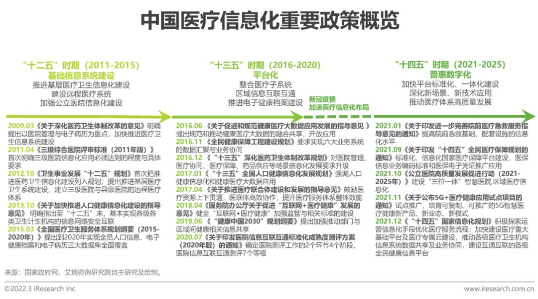 政策是推动我国医疗信息化、智慧医疗发展众多因素中的重中之重。自2009年我国政府启动深化医疗体制改革措施后,政府陆续出台规范标准类、鼓励支持类等多种政策,指导医疗信息化高效有序推进;各省和地级市政府积极响应,颁布切实可执行的具体措施紧紧跟上。国家医疗信息化建设规划呈现阶段性特点,自十二五规划开始,国家明确提出加强医疗卫生领域的信息化建设,有关医药、远程医疗的规范性法规相继出台,医疗信息化建设全面展开;十三五期间,建设以电子病历为核心的临床信息化系统,加速医疗信息系统的打通、多层级医院协同发展成为关注重点,2020年新冠疫情更催化了医疗卫生平台一体化、标准化建设需求;未来在国计民生持续增长需求、新一代信息技术的加持下,以“普惠民生”为核心的医疗信息化将加速推进,打造以患者为中心的卫生医疗体系、建设智慧生态医疗是下一阶段的主要目标。