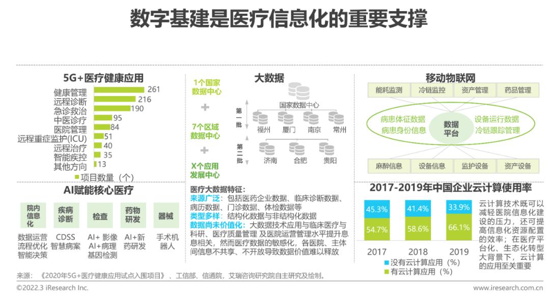 5G、大数据、移动物联网、云计算等是医疗信息化的技术底座,支撑大量垂直医疗场景的信息化应用。我国是全球规模最大、技术最先进的5G独立组网网络,5G与医疗健康领域的结合能有效加强患者与医护人员、医疗机构、医疗设备间的实时互动;多源异构、海量的医疗数据蕴含高价值信息的知识库与资源库,数据资产挖掘重构医疗信息化建设内容及方向。在2016年颁布的《关于促进和规范健康医疗大数据应用发展的指导意见》引导下,我国健康医疗大数据中心建设工作如火如荼展开,1个国家数据中心+7个区域数据中心+X个应用发展中心的总体规划逐步成型,推动数据流、信息流于全国范围内高效流动;此外,大数据与人工智能改变医疗知识发现的路径与方式,创新医疗诊断与决策的方式和渠道,物联网和云计算变革了医疗信息共享和服务模式;可预见的是,未来新一代信息技术与医疗信息化建设将实现更深层次的融合。