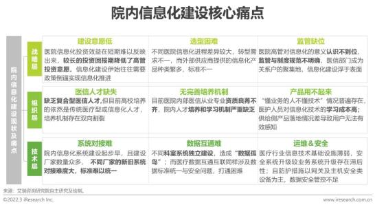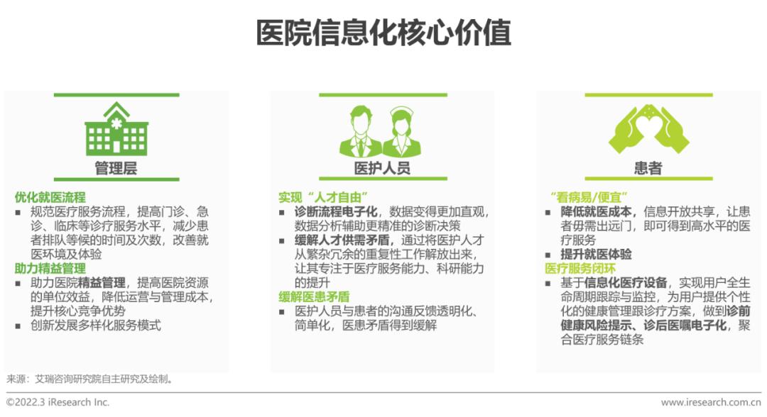 医院发展进入由规模扩张走向提质增效,由粗放走向精细的过渡阶段,对人才、技术、数据等资源要素的重视程度提升,信息化方法论及工具的价值点逐渐凸显。首先,随着医院业务规模与复杂程度扩张、医疗服务供需缺口扩大,医院内部管理的复杂性激增,全业务场景的数据化辅助其构造精细化运营管理体系,实现降本增效提质的效果;其次,院内信息化优化业务流程,解放承担大量冗余工作的医护人员,让其能更加地专注于医疗服务能力提升,也能缓解医护人员短缺的普遍性问题;医疗信息化是工具与手段,为老百姓解决“看病难”“看病贵”难题,优化其就医体验才是建设的核心。医疗信息化整合医疗碎片化的服务链条,让患者诊前、诊中、诊后拥有便捷、高质量的就医体验。