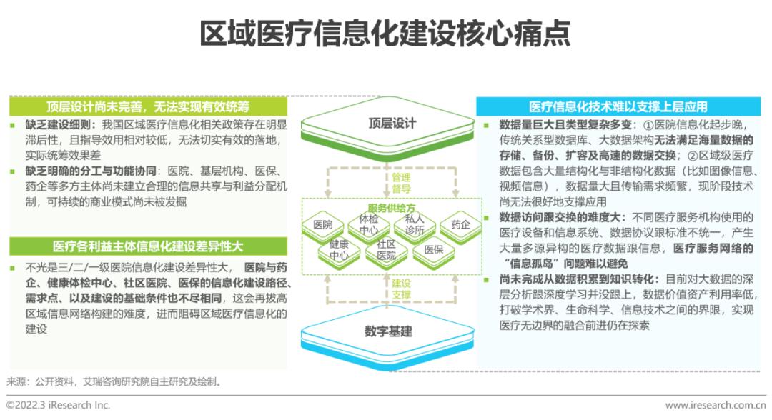 区域信息化是医疗系统信息化的“缩影”,其覆盖的主体数量、系统的复杂程度、数据量是医院信息化无法比拟的。目前建设痛点可分两层拆解来看,其一是区域医疗信息化的建设标准及规范尚未完善,顶层设计不完善直接导致区域医疗信息化协作机制的不健全,卫健委及政府对以医院、医保、药企为核心的主要参与者无法实现有效统筹,而且医保、基层医疗机构信息化发展速度跟医院(尤其是三级医院)信息化发展速度不匹配,会进一步增加合作难度;其二是当前医疗信息化技术难以支撑上层应用,比方说基于数据、信息实时共享的分级转诊、双向转诊等医疗高效协同是区域医疗信息化的基础要求,然而实时数据难分享、集成平台对应用需求的技术支撑弱导致实际应用效果差,用户与患者对转型无法感知,长此以往,医疗各利益主体对信息化的投入热情及意愿也会逐渐衰减,陷入困境。
