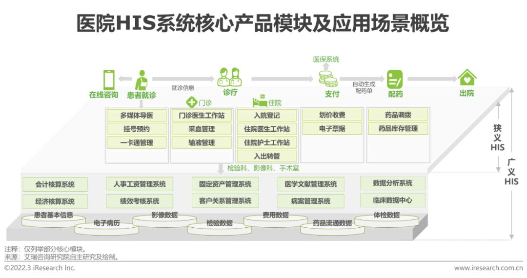 HIS(医院信息化系统)在早期是个更广泛的概念,以财务、收费及管理为核心,覆盖从挂号系统、到医院信息系统所有功能模块,是一个“万金油”产品;经过多年市场实践,其功能随着医院内部业务流程不断梳理与整合,由分散走向深化,与LIS、PACs、RIS、EMR等偏临床的模块逐渐融合,然而由于院内系统建设缺乏统一规划,一家医院信息系统由不同厂商重复建设、信息冗余的问题严重;现阶段针对以往建设问题,医院及厂商改变建设思路及实施方法,加速平台化建设,让HIS成为医院流程整合与服务能力提升的核心引擎,实现对患者诊前、诊中、诊后全程追溯与管控。当前大多数三级、二级医院拥有较为完备的HIS系统,核心需求在于新场景、新功能的迭代升级,以及一体化的平台建设;一级及未定级医院的渗透率略低,且应用的功能模块简单。