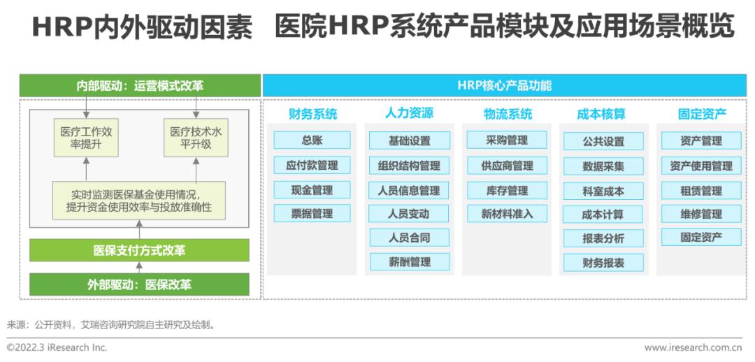在深化医改与多元化办医格局下,HRP(医院资源管理系统)逐渐成为医院精益管理不可或缺的工具。HRP是传统HIS系统中人财物事、药品耗材、资产设备等管理模块的深化应用,其核心功能是通过实现业务系统与财务系统之间的集成与共享,提高医院运营效率,并为医院全面经济核算科学决策提供依据,是提升医疗服务质量的重要手段。HRP与HIS系统的产品定位及面向客群略有不同,自2000年,以经济运营为核心的HRP旨在用成本撬动医院资源的管控;随后,厂商发现同样HRP系统在不同医院的成本控制表现差异大,自此HRP产品定位由经济运营逐渐转向深化管理及战略管控,旨在辅助不同医院客户实现精益运营。现阶段HRP的核心客群仍然是三级以上的医院,三级以下医院整体认知不深、投入不足,未来在医保改革、多元化复合付费方式的驱动下,市场迎来新机会点。