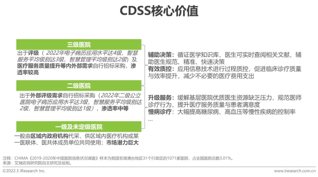 CDSS(临床决策支持系统)是基于人工智能、深度学习等技术,结合医学知识、临床案例和患者病情, 辅助医生分析病历,制定准确有效治疗方案的工具,具备减少医疗差错、提高医疗效率、控制医疗费用支出等优势。当下CDSS已进入规模化应用阶段,于三级医院覆盖面较广,二级及以下公立医院仍具备较大的市场潜力。CHIMA调研报告显示有66.47%的医院认为临床辅助决策系统是当下医院信息系统建设中需要关注的第三位(前二分别是电子病历集成与医疗质量监管)。现下医院评级仍是CDSS的核心外驱,整体看产品同质化程度较高,厂商若想在保持客单价的情况下加速市场拓展,仍需提升其产品质量,使其发挥应用的临床价值。如加速完整、专业的医疗知识库的构建;实现信息实时共享,避免信息重复录用、跨级调用困难等问题出现;深挖终端用户需求,采用更灵活的交付方式,建立标准化系统,提高系统的适用性等。