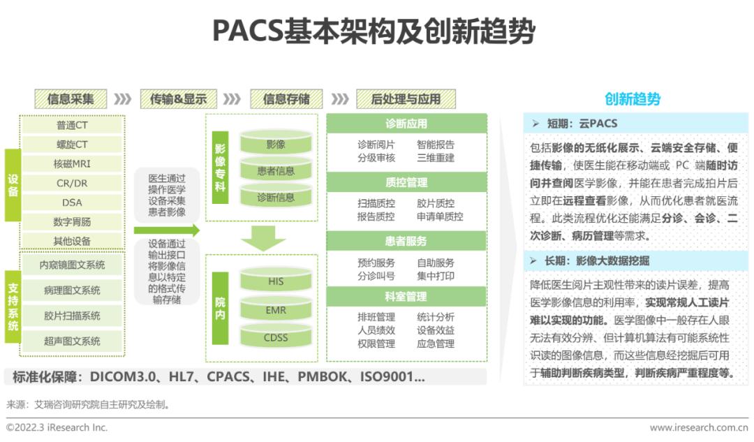 PACS(医学影像信息系统)是基于医学影像存储与通信系统,从技术上解决图像处理技术的管理系统。随着现代医学发展,传统医学影像管理方法已无法适应现代医学影像管理的要求,无胶片化影像科和数字化医院已经成为现代化医疗发展的必然趋势。PACS的功能价值在于通过联接不同的影像设备,存储与管理图像,图像的调用与后处理,实现资源共享,降低成本,达到提高工作效率、提升医疗水平的目的。基于医学信息流动、共享的需求,云PACS及影像大数据的挖掘已成为PACS发展的创新趋势,值得市场关注。