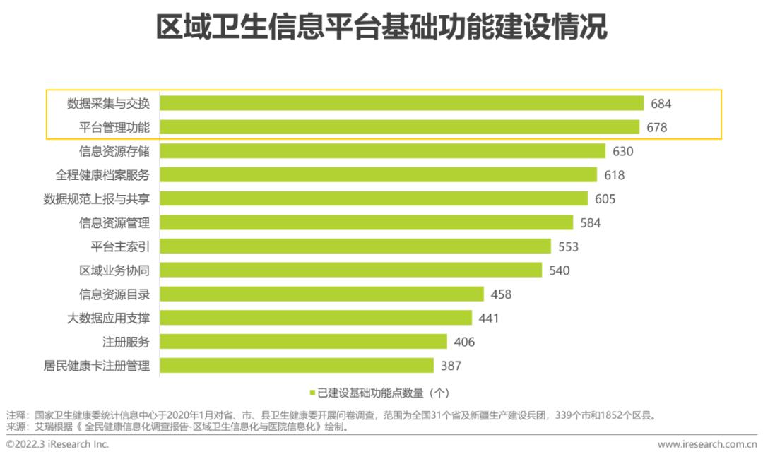 根据国家卫生健康委统计信息中心调查结果,我国省、市、县级区域卫生信息平台建设率分别达到100%、62.8%和46.4%,其中省级区域卫生信息平台建设比较均衡,市级平台东部地区发展明显较快,县级平台东部与中部地区基本持平,西部地区仍处于较落后状态。在平台基础功能建设方面,目前建设率较高的基础功能点主要集中于各级平台间的数据交换共享以及平台的日常管理。